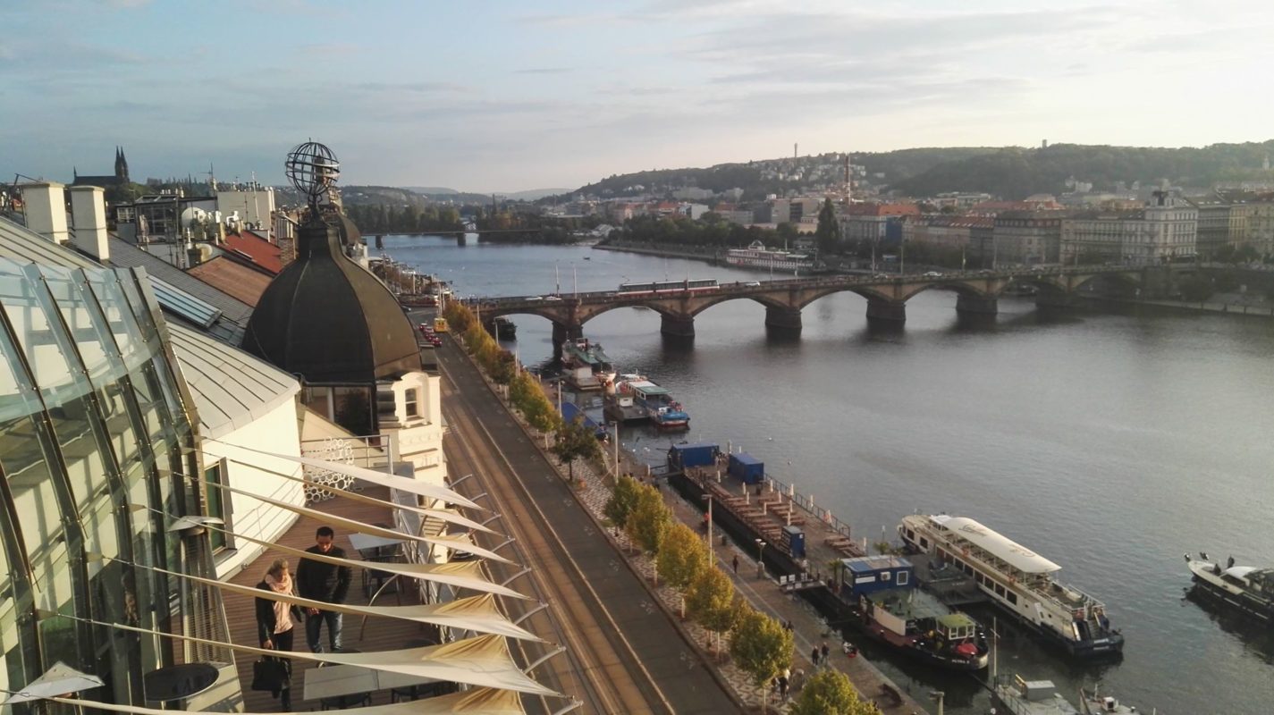 Výhled z Glass Baru v tančícím domě, respektive z jeho terasy, je také skvělý. Hezké posezení hned nad Vltavou. Vidět odtud můžete hned na několik stran. A když se najde místečko na sezení, je tu i poměrně hezký relax. Ovšem musíte najít zrovna čas, kdy tam není X turistů, kteří se přišli jen fotit. Pro hosty Glass baru je vstup na terasu zdarma. Turisté, kteří se přišli jen vyfotit a podívat na výhled, musí platit, a tak se možná jejich počet trochu zredukoval. I tak je jich tu ale mnoho. A tak mnohdy, místo hezkého výhledu, vidíte jen něčí pózy.